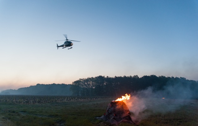 Le brassage d’air par hélicoptère est le moyen de protection le moins onéreux car il ne nécessite pas d’investissement lourd et permet aux vignerons d’être très réactifs. Par ailleurs, cette action est l’une des rares à couvrir une si grande échelle (250 hectares protégés) et à permettre une solidarité entre vignerons au coeur de l’action (ici une trentaine de vignerons réunis).
